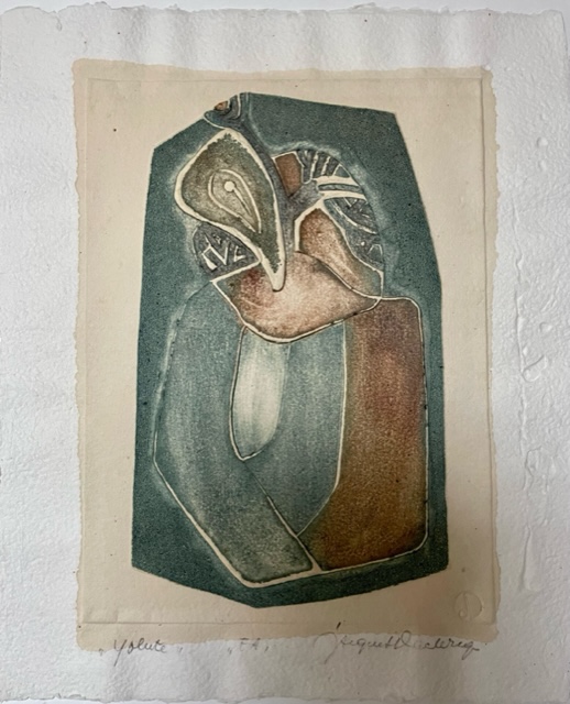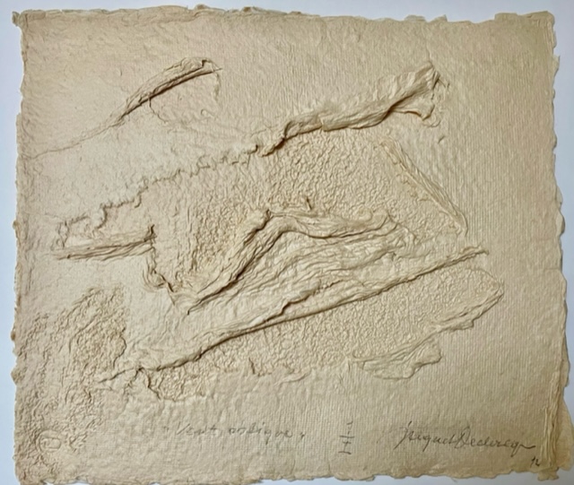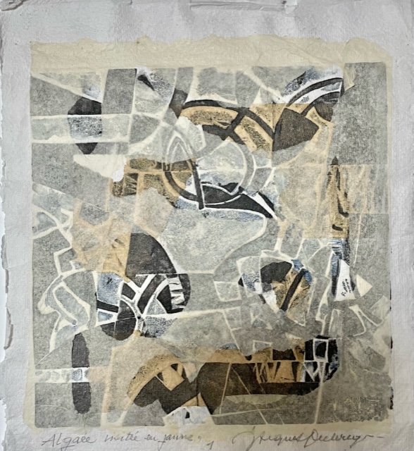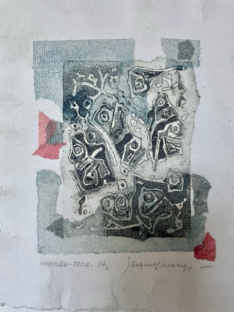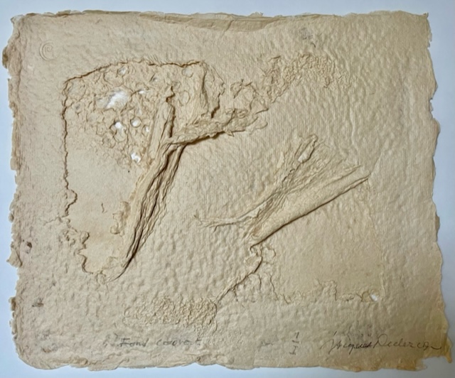 L’artiste est constamment en train de chercher, de tâtonner. Il tente des expériences avec du sable, des coquilles d’œuf, des épluchures d’agrumes… de manière à obtenir des tirages uniques à chaque fois, amusant détournement là aussi d’un procédé de reproduction. « Je crois que c’est un peu la recette pour ne pas s’ennuyer », plaide-t-il. Jacques Declercq, 92 ans, doit probablement à sa pratique artistique une part de sa longévité. Elle lui permet aussi, à lui qui a perdu son épouse durant la crise sanitaire, d’ouvrir des fenêtres vers d’autres dimensions.
