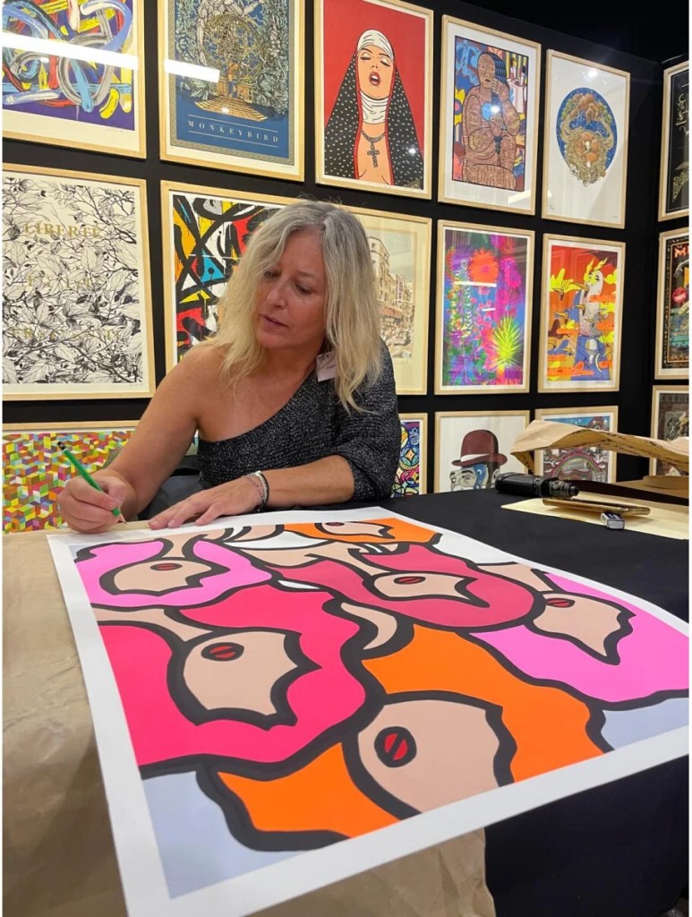 Adoptant une approche gaie et lumineuse de la couleur et de la silhouette, elle compose des portraits amusants à l’encre de Chine ainsi que des œuvres pop art, le tout dans son univers singulier de Petites Nanas.