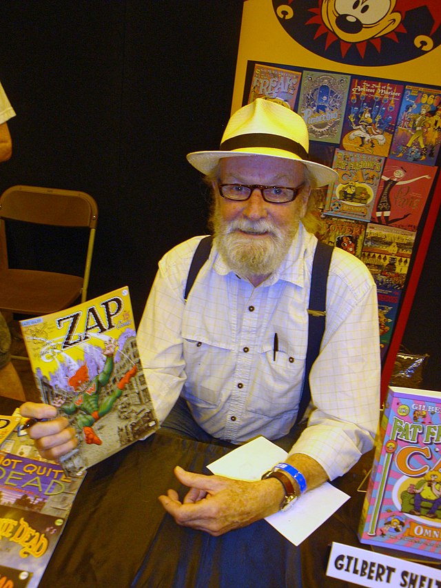Gilbert Shelton, né le 31 mai 1940 à Houston, est un auteur de bande dessinée états-unien vivant à Paris. Il commence sa carrière en 1959 dans le journal estudiantin Ranger. En 1969, il crée les Fabulous Freak Brothers qui le rendront célèbre. Avec Robert Crumb et Vaughn Bodé, Gilbert Shelton est un des auteurs les plus marquants de la bande dessinée underground américaine. Il continue de publier dans le Zap Comix. Il est aussi le créateur de Superphacochère, super héros très politiquement incorrect. Depuis 1992, il écrit et dessine avec Pic Lelièvre les aventures de Not quite Dead, le pire groupe de Rock’n’Roll au monde, avec souvent Géant Vert comme co-scénariste.
